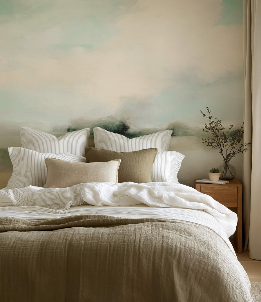 Evergreen forest murals carry a quiet power — the deep green palette is grounding and restorative, and the sense of depth in the painting makes the wall feel like it extends into another space entirely. This design works in a bedroom where the forest-green palette promotes deep, restful sleep, in a study or home office where the natural scene supports focus and calm, or in a living room where the mural creates a connection to nature that urban environments lack. The all-green palette is remarkably versatile — it pairs with warm timber in oak, ash, and walnut, with metals in brass, black, and aged bronze, and with textiles in virtually any colour because green is nature's neutral. Style it with natural materials throughout — raw linen, soft wool, warm leather — and keep lighting warm to prevent the cooler blue-grey tones from dominating. A room with a fireplace and this mural behind the sofa creates a cabin-like atmosphere that is deeply comforting.