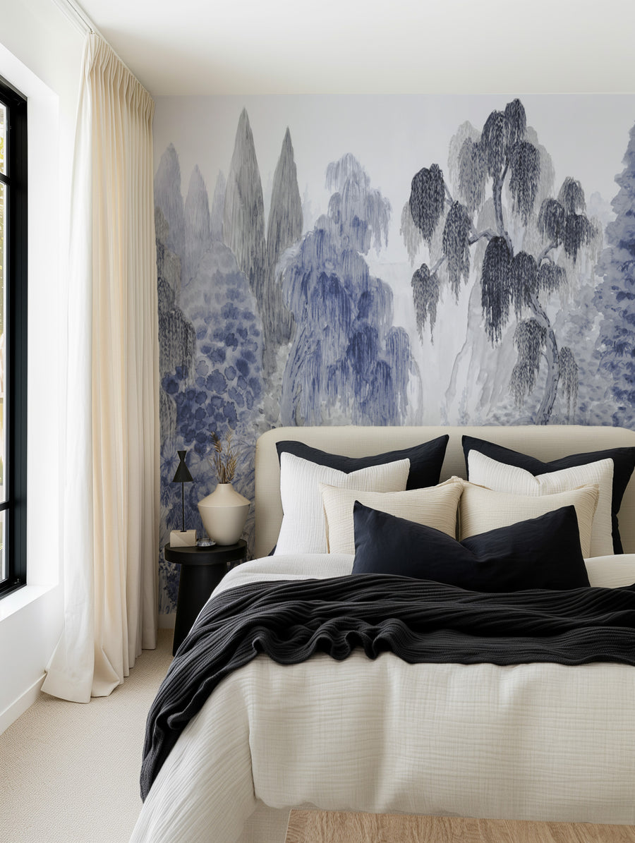 Japandi Garden Panoramic Mural Navy Blue on White Mural Wallpaper