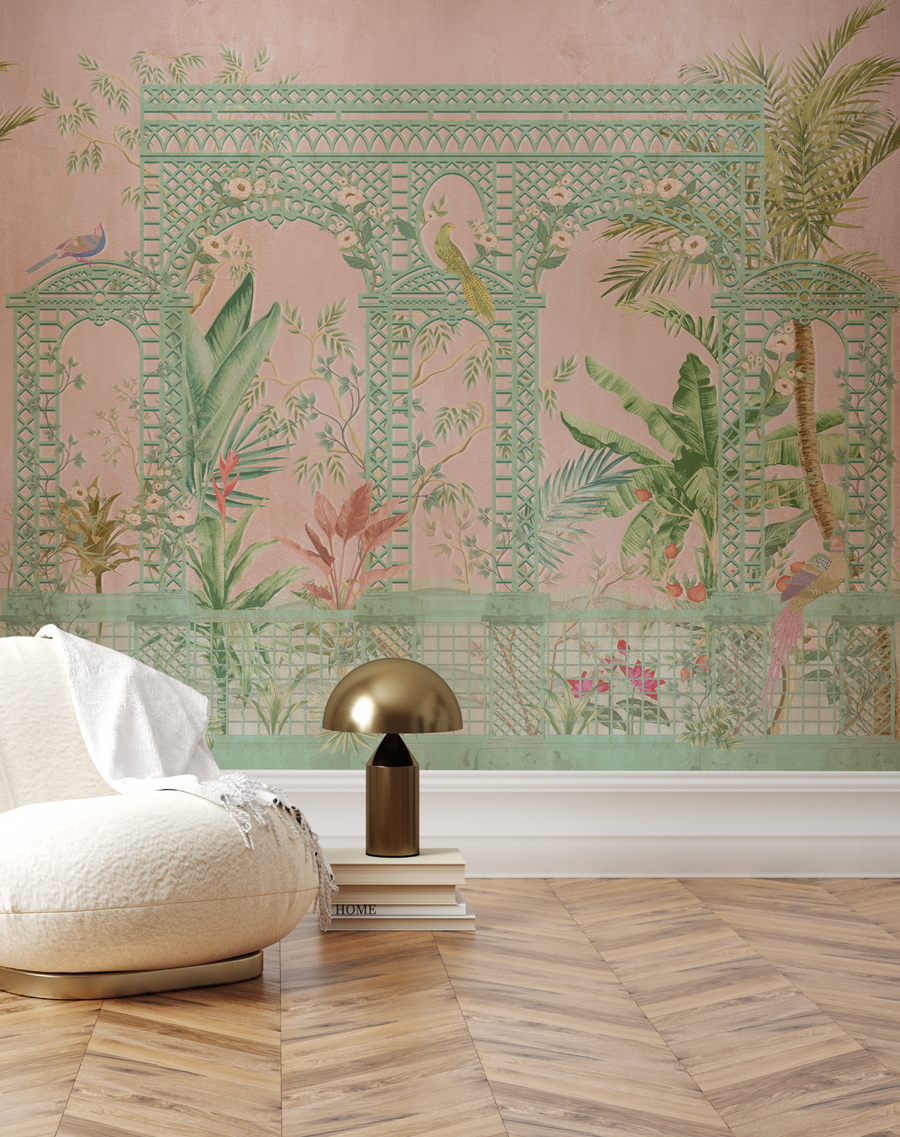 Chinoiserie lattice in pink — an intricate pattern where Moorish-inspired geometric archways frame lush tropical scenes of palm fronds, climbing vines, flowering plants, and ornamental birds. The dusty rose and sage green palette gives this centuries-old decorative tradition a contemporary softness. The level of illustrative detail is remarkable — each archway reveals a different botanical vignette, which means the pattern tells a story across the wall that rewards extended looking.