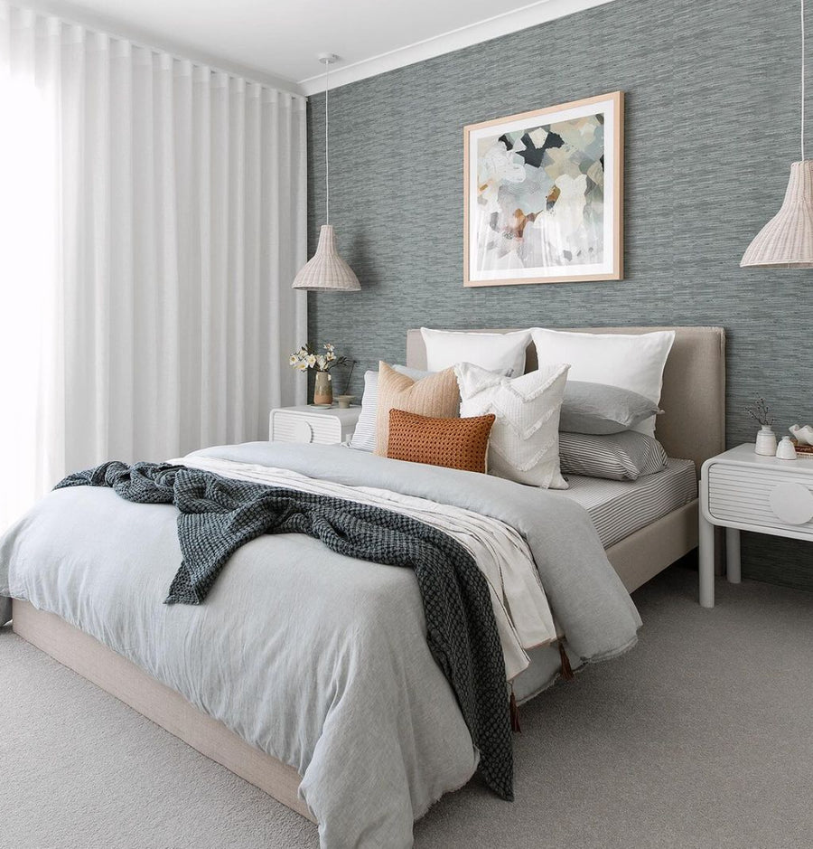 In a study, the charcoal grasscloth creates the atmosphere of a private library — pair with dark timber, a leather chair, and brass reading lamps. In a bedroom, the deep charcoal wraps the room in warmth and depth. In a dining room, it creates intimate atmosphere for evening entertaining. The faux grasscloth is also available in the Paste the Wall Smooth finish for bathrooms and the Commercial Vinyl for hospitality spaces. Pairs with dark timber, brass, cream textiles, and warm lighting.