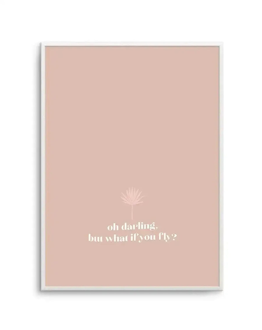 A typographic art print presenting the words "Oh Darling, But What If You Fly" in a refined script against a clean, minimal ground. The type treatment is elegant and considered — a mix of cursive and serif letterforms in soft black or charcoal, with enough white space to let the message breathe. The overall effect is warm and encouraging without being saccharine, with a visual weight that holds its own on a wall alongside stronger pieces.