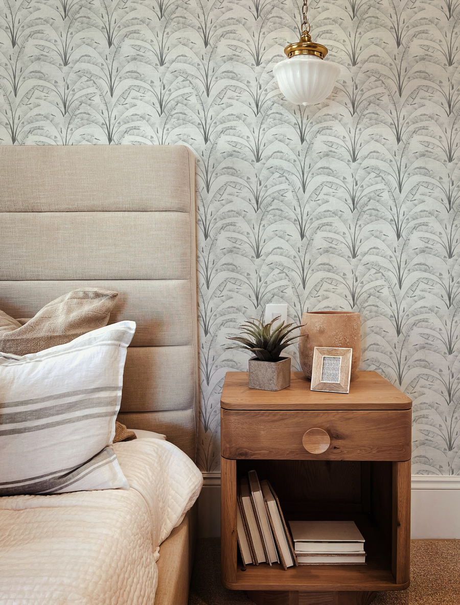In a living room, creates resort atmosphere with rattan and brass. In a bedroom, the feeling of waking up somewhere warm. In a bathroom, install with Paste the Wall Smooth for a tropical spa. Pairs with rattan, warm timber, brass, real plants.