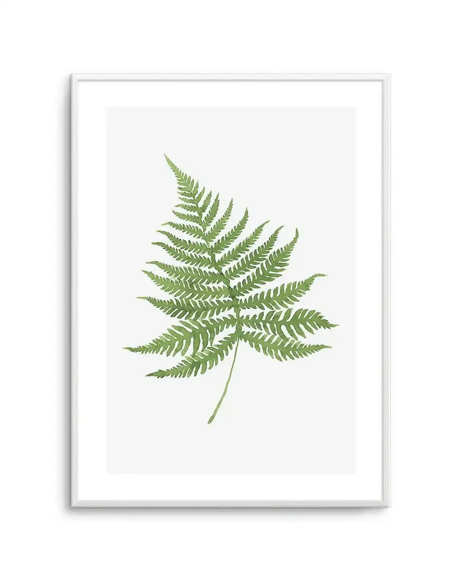 This pairs naturally with Fern on Grey II as a diptych — the two fronds create a visual conversation when hung together, balanced enough for above a bed or flanking a window. On its own, it holds a narrow wall or shelf nook with quiet authority. The grey background integrates seamlessly into Scandinavian, Japandi, and warm minimalist interiors. Lean it on a timber shelf with a potted maiden fern and a stone candle holder for an effortless vignette, or hang it in a bathroom alongside white subway tiles and brass fixtures. Oak frame warms the green tones; black frame gives it the feel of a framed herbarium specimen in a collected study.