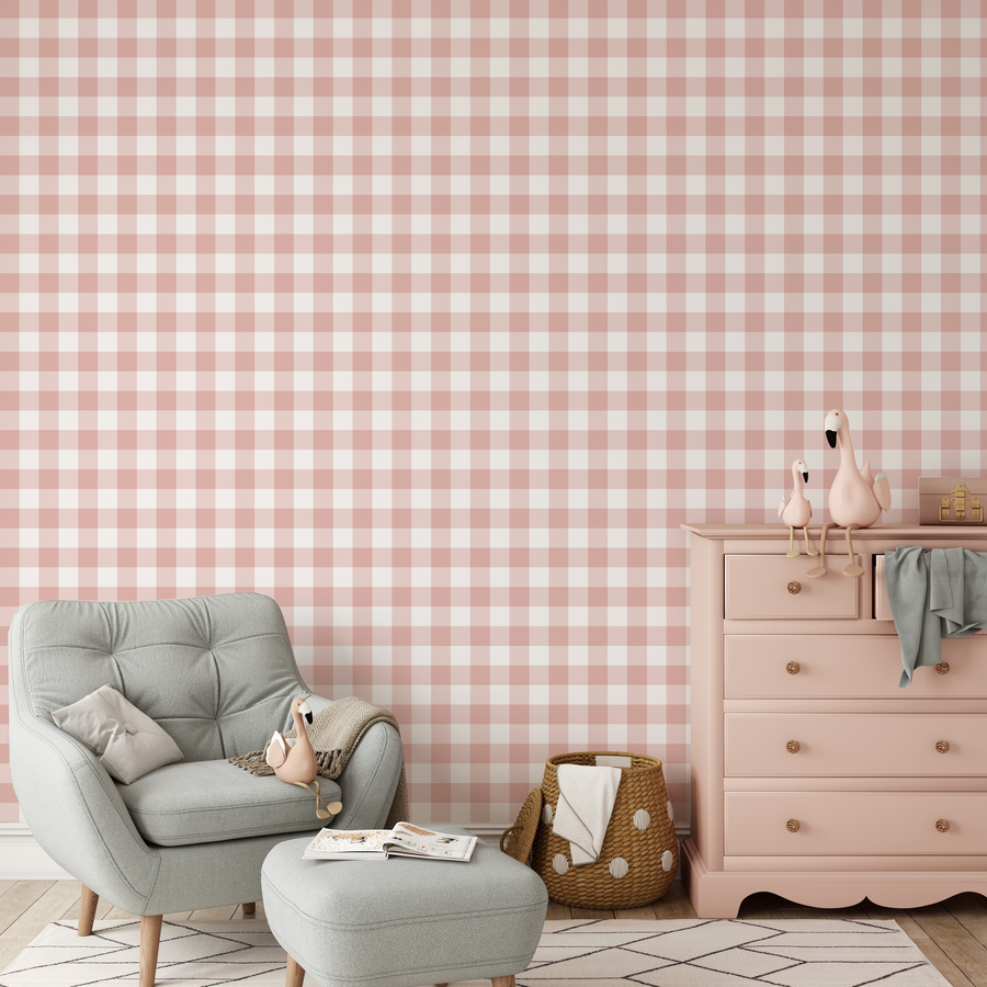 The most refined scale in the rose pink gingham range — a small, tight check that delivers the richness of the rose tone as an all-over wall texture rather than a graphic pattern. From across the room, the wall reads as a warm, saturated rose; up close, the gingham grid reveals itself with satisfying precision. This is the version for when you want the colour — that deep, vintage rose — without the visual weight of a large check. It works as a full-room wrap in a bedroom, creating a cocoon-like warmth that envelops the space. It works in a hallway where the fine check adds colour and character without closing the space in. And it works in a guest bathroom where the rose tone adds personality to an otherwise neutral scheme. The colour is consistent with the Large and Medium — mix scales across adjoining rooms for a layered, curated effect. Pair with white-washed timber, matte black hardware for modern contrast, or brass and velvet for warmth.