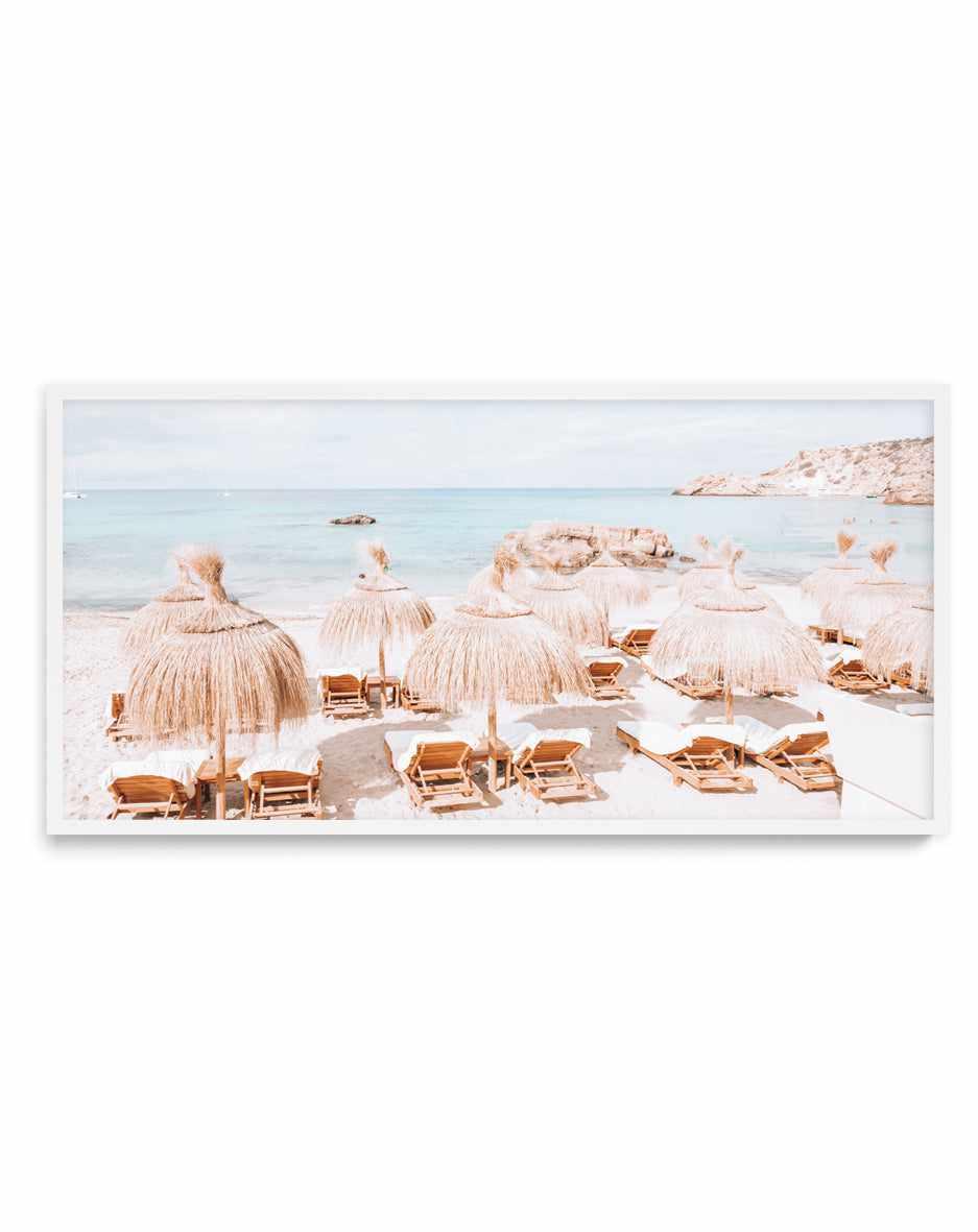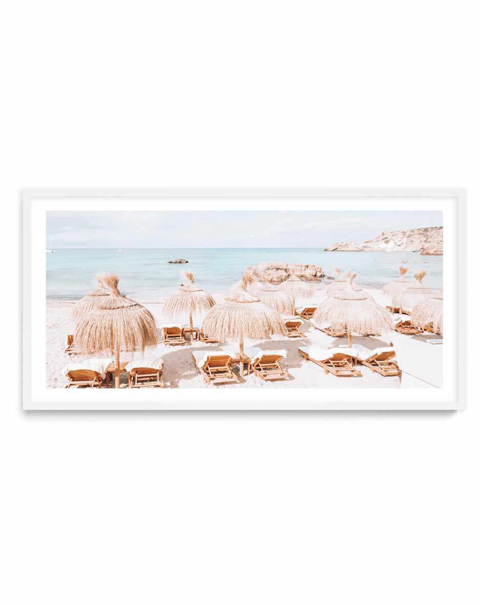 View of the Beach, Loungers and Rug Coated Parasols with a Blue Sky and White Sand Colored. Fine Art Photography