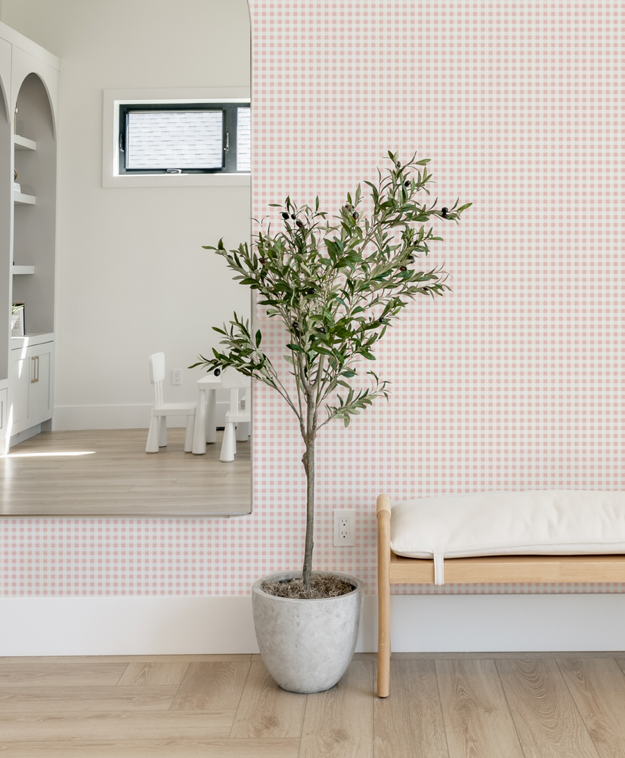 Petite checkers in soft doll pink and white — a tighter, more refined version of the checker pattern that reads as a classic gingham from a distance. The pink is gentle and warm, a true dusty rose rather than a bright bubblegum, which is why it works in nurseries, children's rooms, and adult spaces with equal confidence. The white squares keep the pink feeling fresh and airy.