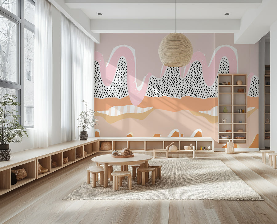 Waves & Spots Mural in Pink & Orange Commercial Vinyl Wallcovering