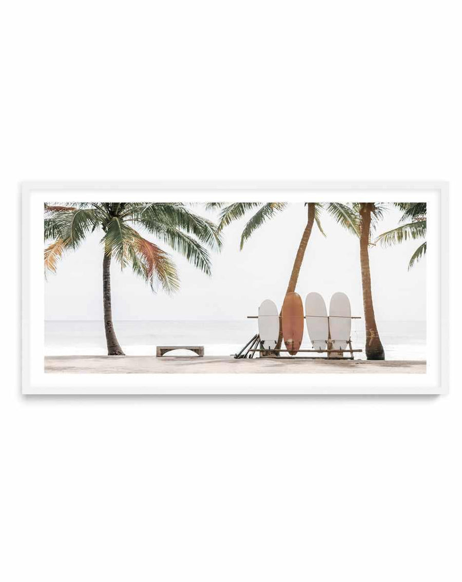 Perfect for living spaces seeking coastal calm without the expected blues and nauticals — this works beautifully in contemporary homes where the ocean is felt rather than shouted. The horizontal format complements low-profile furniture and open-plan living, while the neutral palette pairs effortlessly with natural linens, blonde woods, and stone surfaces. This is surf art for grown-ups: thoughtful, refined, timeless. Frame in Oak to warm the earth tones, or White for crisp minimalist presentation. Cross-reference with other contemporary surf culture pieces for a collected aesthetic that celebrates the lifestyle without the stereotypes.