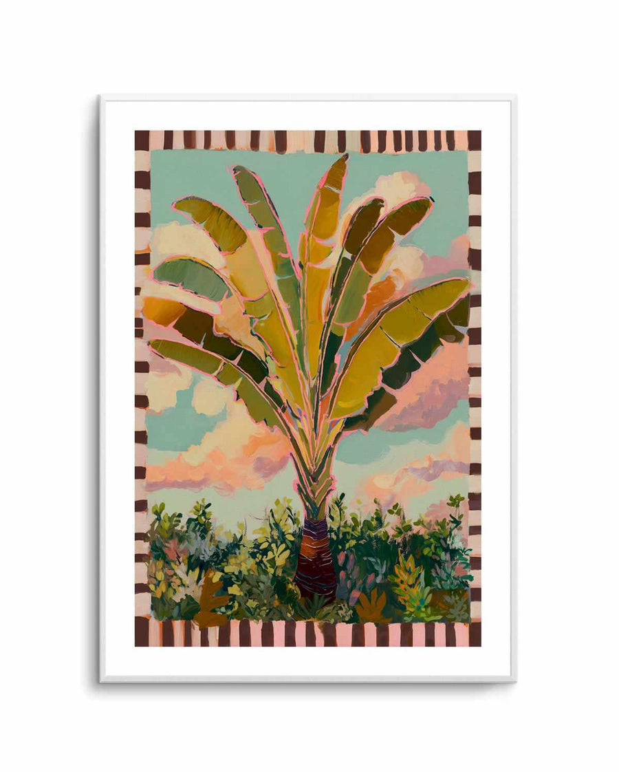 This contemporary botanical illustration features a stylized banana plant with vibrant green and yellow fronds set against a dreamy pastel sky filled with soft turquoise, coral, and peach clouds. The digital artwork combines modern graphic design with decorative Art Deco influences, featuring bold outlines and flat color areas that create a contemporary travel poster aesthetic. The warm harmonious palette of mint greens, coral tones, and earth browns, framed by a distinctive striped border, evokes vintage botanical expedition art.