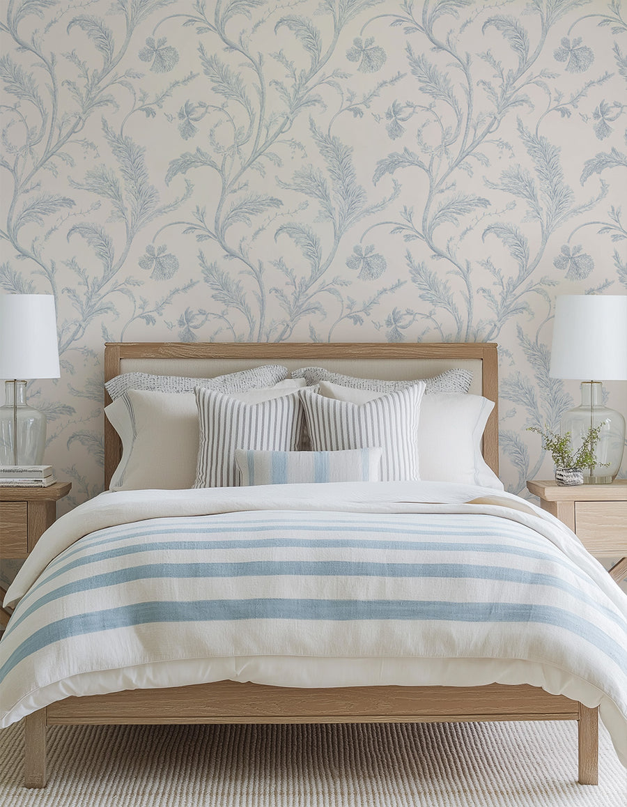This pattern brings a subtle coastal elegance without being overly literal. In a living space, it creates a bright and relaxed atmosphere. In a bedroom, the gentle vertical flow of the foliage adds softness and height. In a powder room or bathroom, it delivers a clean, elevated coastal look — especially when installed across all walls for a cohesive finish. Pairs beautifully with white furniture, light timber, brushed nickel or brass finishes, and blue-and-white accents.
