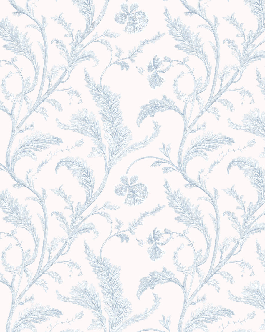 Coastal Canopy in Hamptons Blue — a refined botanical pattern featuring delicate, flowing foliage in soft blue tones layered over a clean white backdrop. The design captures the lightness of coastal living, with airy branches and fine detailing that create a sense of movement and calm. The Hamptons blue palette is classic and understated — crisp, fresh, and effortlessly sophisticated.