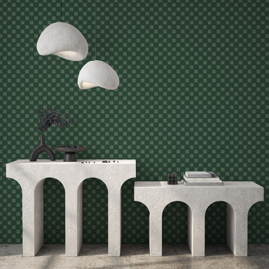 Diamond Motifs in dark green — a repeating diamond pattern in cream on a deep forest green ground. The diamonds are small-scale and precise, creating an all-over texture that reads as rich, structured fabric. The dark green with cream diamonds references the tradition of decorative tilework and textile design that spans cultures from Morocco to Scandinavia. The small scale means the pattern works on all four walls without becoming intense.
