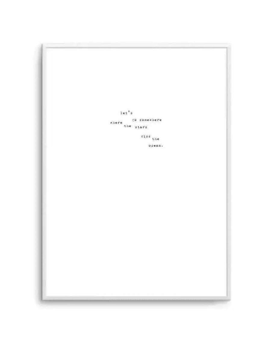 Dreamscape is a typography print featuring a poetic line — "let's go somewhere where the stars kiss the ocean" — arranged in a scattered, organic layout across a white background in a typewriter-style font. The words are deliberately spaced and staggered, creating visual rhythm and movement rather than reading as a straight line of text. The typewriter font gives the piece a literary, collected quality — as though it was typed on a whim and pinned to the wall. The mood is romantic and wanderlust-filled.