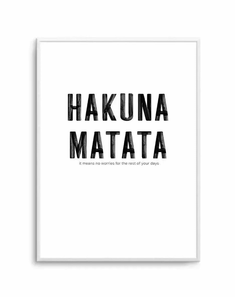 Hakuna Matata is a typography print featuring the phrase in bold, slightly textured sans-serif capitals against a warm cream background, with the translation — "it means no worries for the rest of your days" — printed in lighter grey below. The distressed texture in the main text gives it a relaxed, lived-in quality that takes the graphic weight of the capitals and softens it into something approachable. The composition is centred and clear, with the hierarchy between the bold headline and the quieter subtitle guiding the eye naturally. The mood is calm, uplifting, and reassuring.