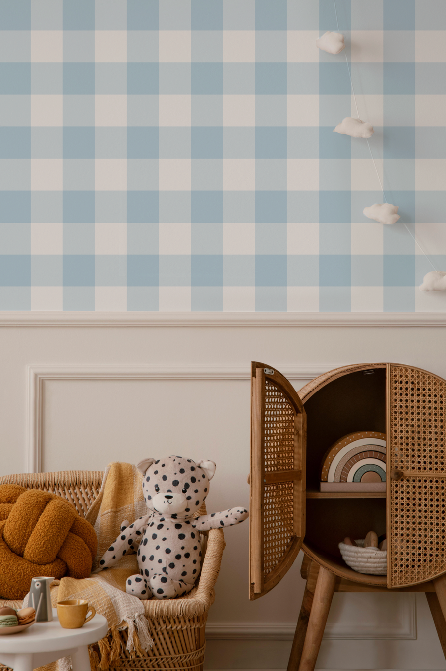 A mid-scale gingham in soft sky blue and white — the same clean, spring-morning blue as the Large, refined into a tighter check that brings pattern interest without the graphic boldness of the larger grid. This is the scale that works in the most spaces: it reads as fresh and characterful in a bedroom, crisp and welcoming in a hallway, and cheerful in a laundry or mudroom where you want colour that lifts the mood. The light blue is universally flattering — it brightens cool-light rooms and calms warm-light rooms, making it one of the easiest gingham colourways to live with. Pair with white-painted furniture, natural timber in oak or ash, and soft textiles in white, cream, or navy. Style a child's bedroom with this wallpaper, white bedlinen, and a couple of navy cushions for a room that stays relevant for years. See the Small for an even subtler version of this palette.