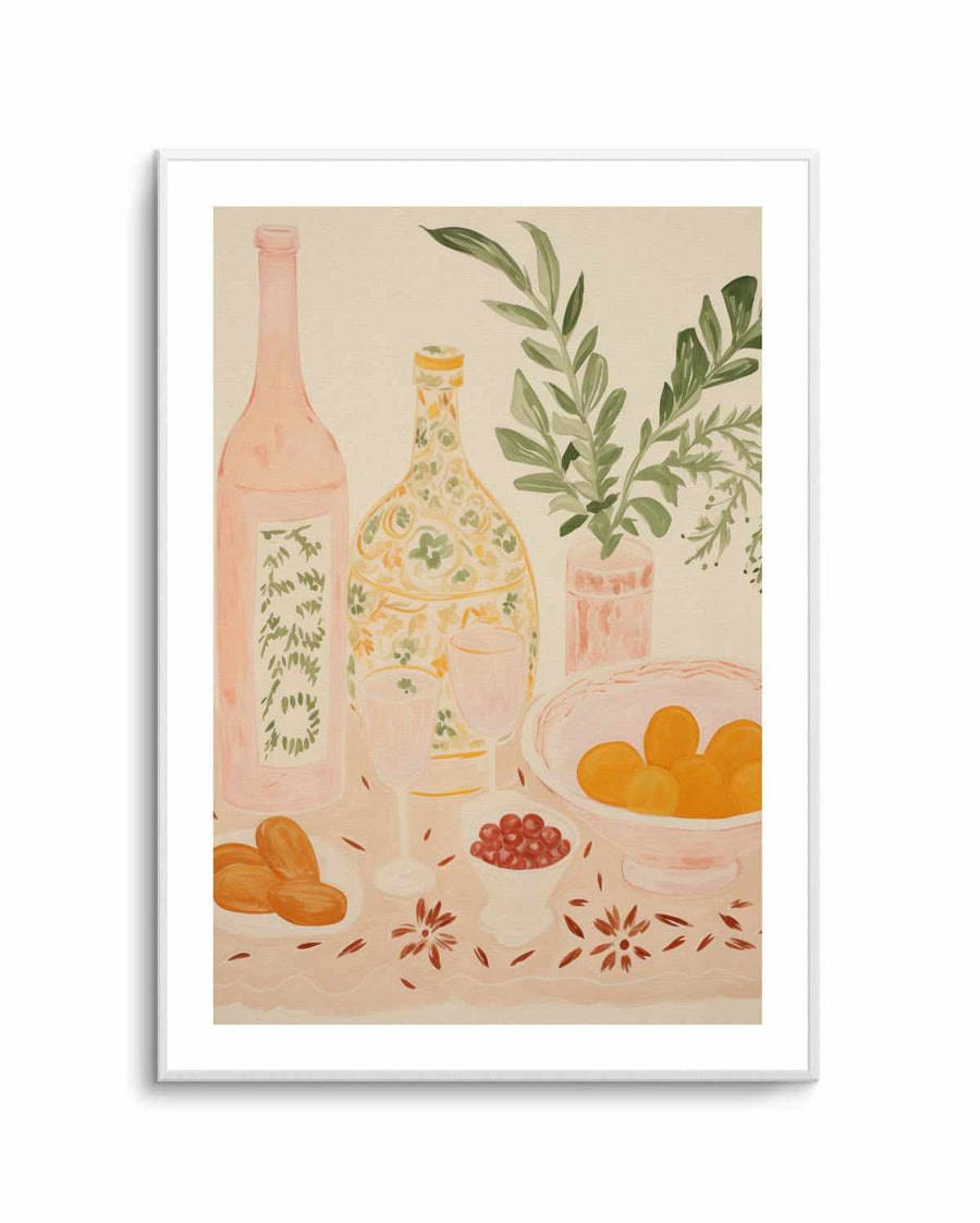 This piece brings the warmth of Marrakech entertaining to dining rooms, kitchens, or any space that celebrates the beauty of shared meals. The soft palette of peachy pinks and sage greens pairs beautifully with Mediterranean-inspired interiors — think terracotta tiles, brass accents, and woven textiles. Perfect for homes that embrace the slow food movement or continental dining aesthetic. Display with Marrakech Brunch No I to create a diptych celebrating the art of leisurely entertaining. Oak frame enhances the warm, earthy tones, White frame for crisp gallery presentation.
