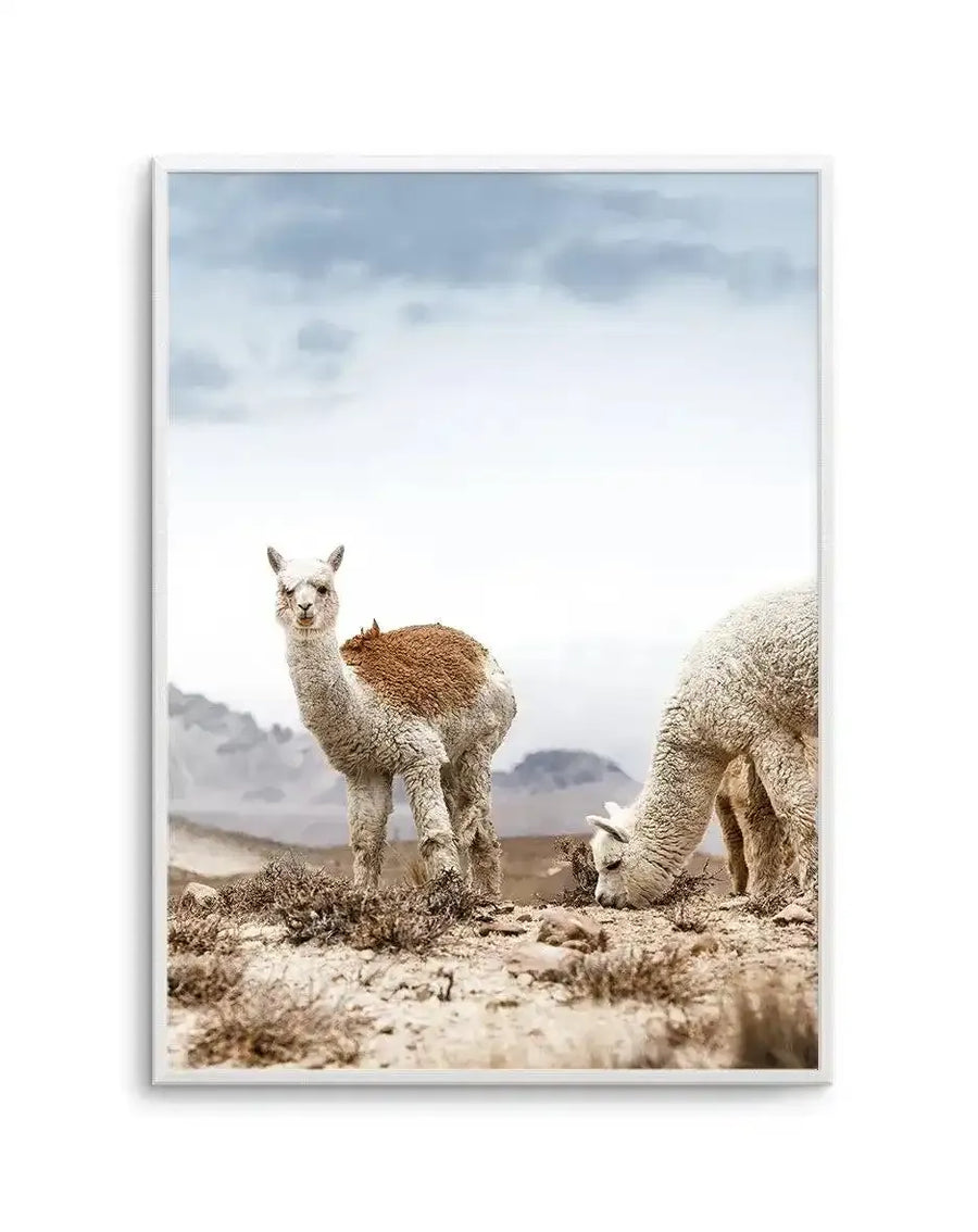 Portrait format works where landscape format does not — narrow walls, beside doorways, flanking a window, or in a hallway where vertical orientation guides the eye. It is equally at home in a bathroom, a laundry, or a reading nook where a single, characterful piece adds personality without dominating. The warm earth palette pairs with the same natural materials — timber, leather, woven textures, ceramic — and the llamas add a conversational quality that few landscape photographs achieve. Oak frame for warmth; White frame for a lighter touch. Compare with the LS version to see which format suits your wall dimensions and room proportions.
