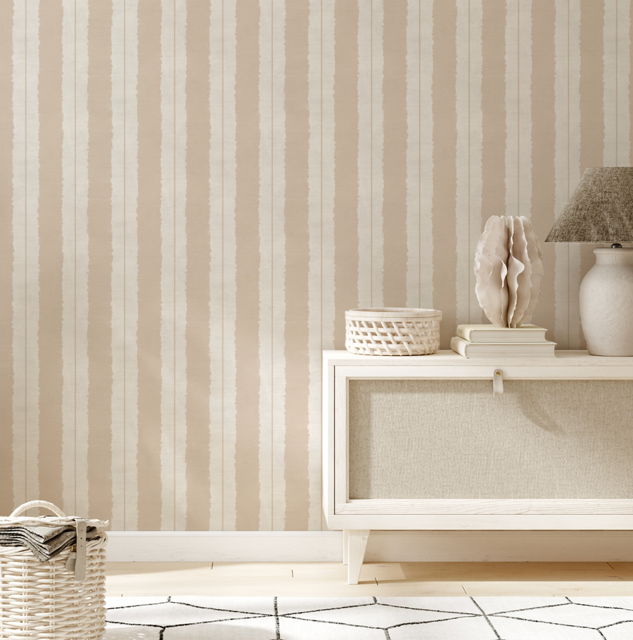Painterly stripes in beige and cream — the most neutral version of the Painterly Stripe range, where three tones of warm neutral alternate in soft, hand-brushed vertical bands. The stripes are barely there — they read as warm, animated texture rather than a colour decision. This is stripe for people who want visual rhythm without committing to colour.
