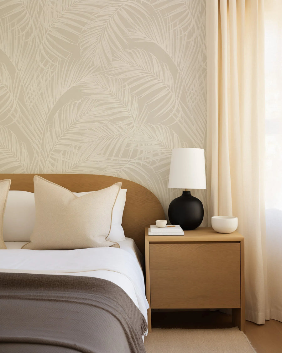 Palm Escape Cream & Beige Wallpaper — tropical foliage in beige, cream with lush energy and bold botanical forms that bring warmer climates onto the wall.