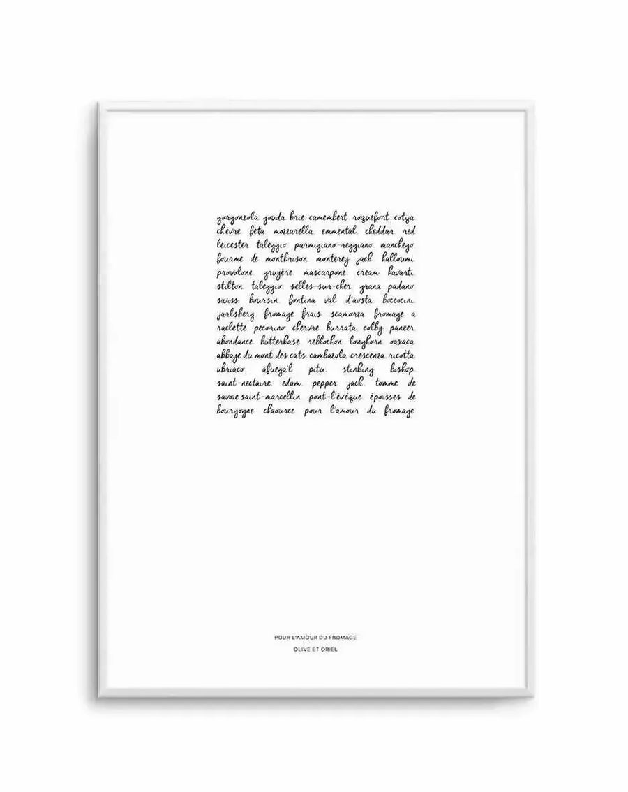 For The Love Of Cheese is a kitchen print through and through — hang it above the bench, beside the pantry, near the cheese board, or in the dining room where it provides a warm, humorous note to evening entertaining. It works in any kitchen style: farmhouse with timber and open shelving, modern with marble and brass, industrial with concrete and steel, or coastal with white cabinetry and natural timber. For a curated kitchen gallery wall, pair with other food-themed typography prints like Oh Crepe and White Wine for a collection that celebrates the kitchen as the centre of the home. It also makes a thoughtful, personal gift for anyone whose kitchen is their favourite room. Frame in Oak for warmth that suits a kitchen environment, White for gallery-clean presentation, or Black for a graphic finish.