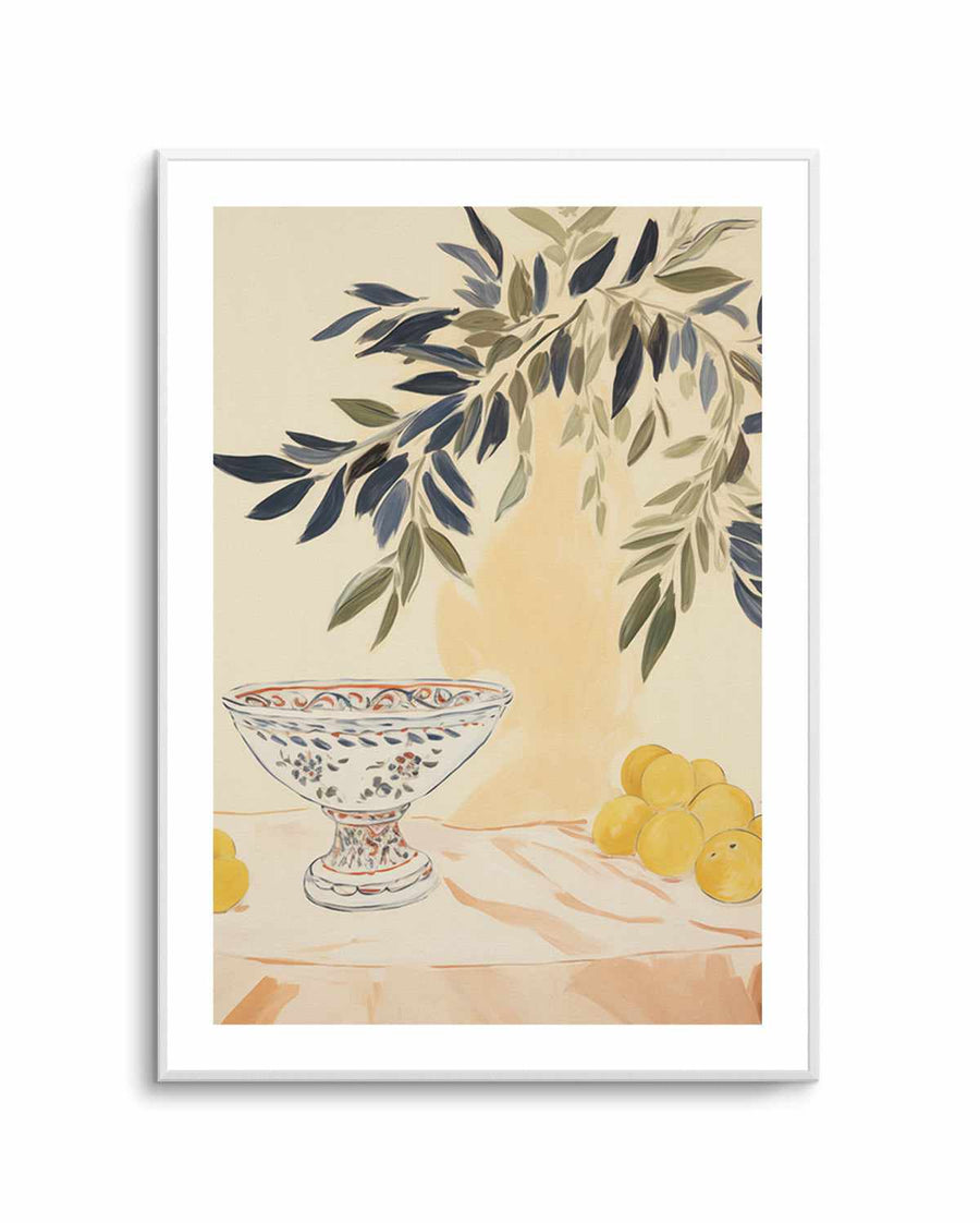 Perfect for breakfast nooks and dining areas where the ritual of morning meals becomes an art form, particularly spaces featuring warm timber, ceramic collections, and Mediterranean-inspired design. The golden palette works beautifully with brass hardware, terracotta tiles, and natural linen textures. Frame in Oak to enhance the warm tones, or White for clean gallery presentation. Pairs beautifully with Tuscan Mornings No I for a complete Mediterranean still life celebration.