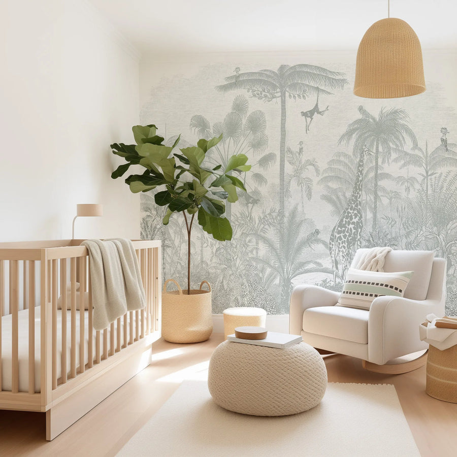 Vintage Jungle in Soft Sage Wallpaper Mural — tropical foliage in sage that brings the lush energy of warmer climates onto the wall. The botanical forms are bold and graphic, with the kind of natural presence that tropical plants bring to any space. The colour palette gives the tropical subject a specific character — whether coastal, earthy, or contemporary — that shapes the room's personality.